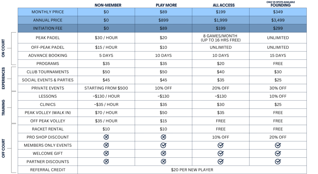 The Founding Membership is our newest, limited membership (capped at 25 members) for our most dedicated padel players. It offers truly unlimited court access (peak & off-peak padel), free programs, 40% off socials and tournaments, 10-30% off on lessons & clinics, priority booking (15 days), and exclusive founding perks. Over $1,00 in direct membership value for just $350/month.